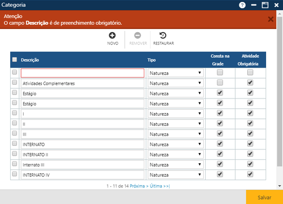 Após clicar no botão Novo, o sistema apresentará a lista das Categorias já cadastradas com uma nova linha em branco no final da lista, o usuário deverá preencher os campos Descrição, Tipo, consta na Grade e Atividade Obrigatória em seguida, o usuário deverá clicar sobre o botão Salvar, para que a aplicação registre no sistema a nova Categoria. Caso os dados sejam preenchidos corretamente, o sistema apresentará a mensagem "O registro foi atualizado com sucesso".