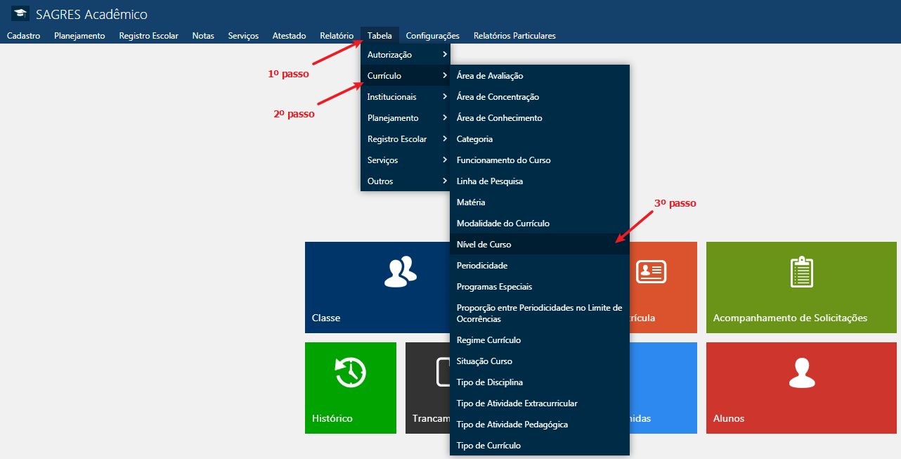 Menu da tabela Nível de Curso