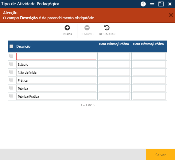 Acionando o botão Novo, o sistema permitirá a inclusão de um novo tipo de Atividade Pedagógica. O botão Remover permitirá que o usuário remova da interface um ou mais tipos de Atividades Pedagógicas já cadastrados. E finalmente, o​ botão Restaurar, que ​permite a recuperação das informações marcadas para remoção, removidas da interface (botão Remover), mas antes do usuário atualizar as informações no sistema (botão Salvar).