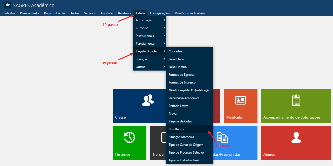 Tabela contendo códigos, nomenclaturas e atributos referentes aos resultados obtidos pelos Alunos nas Atividades Curriculares. Acessível pelo menu Tabela > Registro Escolar > Resultados, no Sagres Acadêmico, no perfil do Secretário.